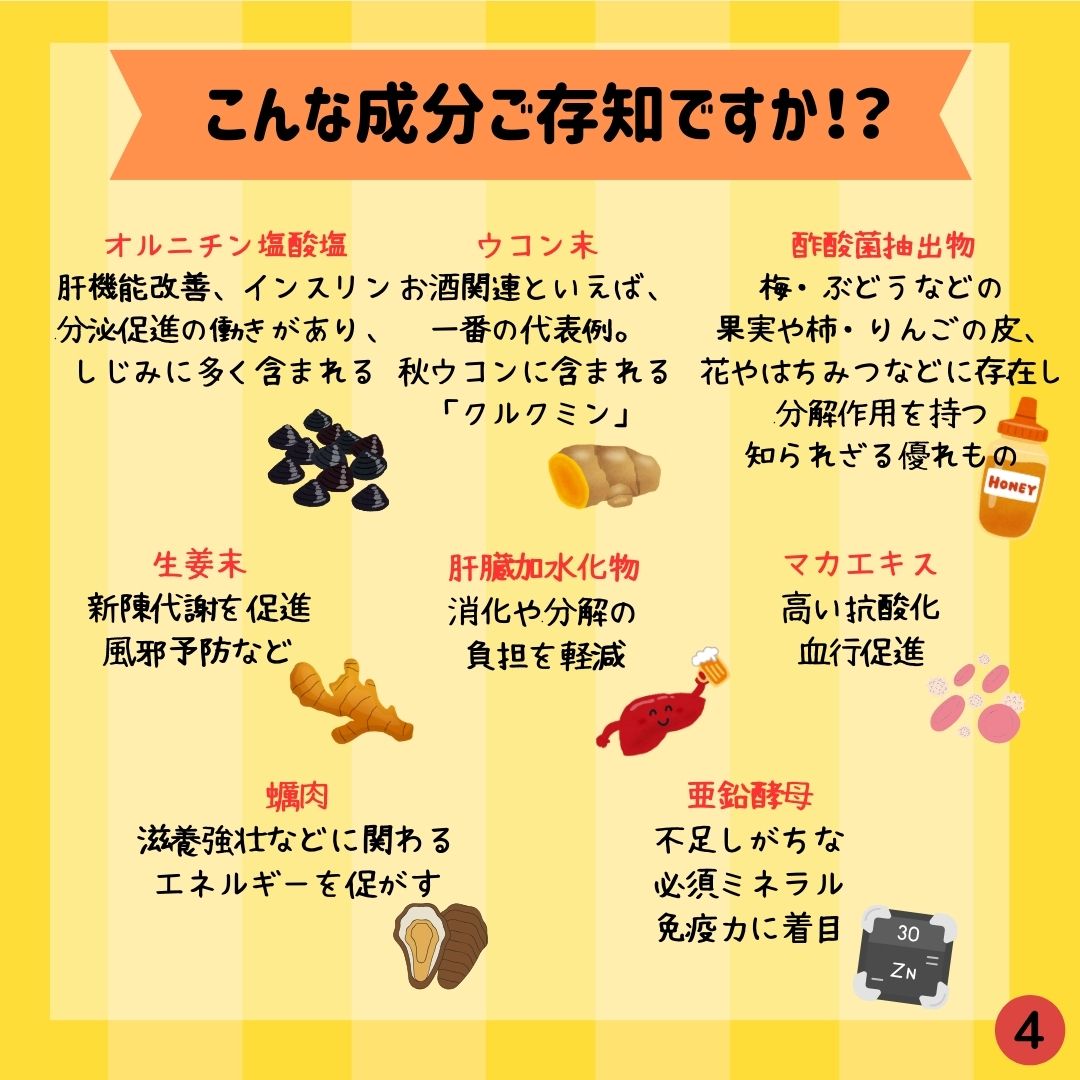 □原材料 L-オルニチン塩酸塩、酢酸菌抽出物(マルトデキストリン、グルコース、酢酸菌エキス(大豆を含む)、キトサンオリゴ糖(かにを含む))、ショウガ末、秋ウコン末、豚肝臓分解物(豚肉を含む)、亜鉛酵母、カキエキス、マカエキスパウダー/結晶セルロース、HPC、ステアリン酸Ca、微粒酸化ケイ素、香料